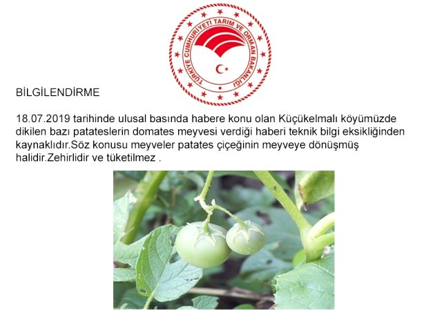 Pazaryeri ilçe Tarım Müdürlüğü konuyla ilgili sosyal medya hesabından bir açıklama yaparak vatandaşları bilgilendirdi. Pazaryeri ilçe Tarım Müdürlüğü patates yapraklarında yetişen domatese benzer görünümlü bitkilerin “patates çiçeğinin meyveye dönüşmüş” halidir diyerek zehirli olduğunu bildirdi ve “tüketilmemelidir” dedi. Pazaryeri ilçe Tarım Müdürlüğü sosyal medya hesabı üzerinden yaptığı açıklamada, “18.07.2019 tarihinde ulusal basında habere konu olan Küçükelmalı köyümüzde dikilen bazı patateslerin domates meyvesi verdiği haberi teknik bilgi eksikliğinden kaynaklıdır. Söz konusu meyveler patates çiçeğinin meyveye dönüşmüş halidir. Zehirlidir ve tüketilmez” denildi.