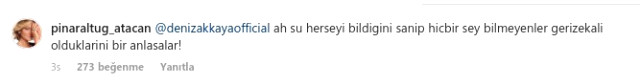 Hilal Cebeci’nin açıklamasını paylaşan Deniz Akkaya’nın paylaşımı sayesinde gören oyuncu Pınar Altuğ Atacan, “Ah şu her şeyi bildiğini sanıp hiçbir şey bilmeyenler, gerizekalı olduklarını bir anlasalar” diyerek tepki gösterdi.