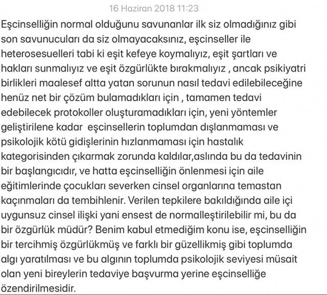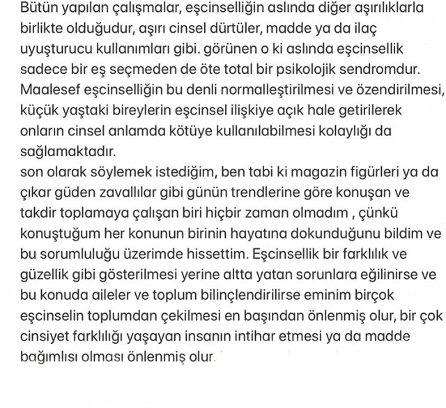 Ünlü isimlerin tepkisinin ardından açıklama yapan Hilal Cebeci, “Eşcinselliğin normak olduğunu savunanlar ilk siz olmadığınız gibi son savunucuları da siz olmayacaksınız, eşcinseller ile heterosesuelleri tabiki eşit kefeye koymalıyız, eşit şartlar ve haklar sunmalıyız. Bütün yapılan çalışmalar, eşcinselliğin aslında diğer aşırılıklarla birlikte olduğudur, aşırı cinsel dürtüler, madde ya da ilaç uyuşturucu kullanımı gibi” dedi.