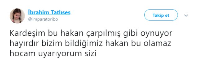 Twitter hesabından İzlanda-Türkiye maçı sonrası mesaj yayınlayan İbrahim Tatlıses, “Kardeşim bu Hakan çarpılmş gibi oynuyor hayırdır bizim bildiğimiz Hakan bu olamaz hocam uyarıyorum sizi.” ifadelerini kullandı.
