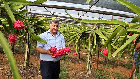 Beyrebucak Mahallesi’nde yaşayan Mahmut Yüksel, internette gördüğü pitahaya meyvesini araştırarak ekmeye karar verdi.