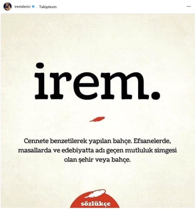 “Şimdi benim valide bana hamile , harıl harıl herkes isim düşünüyor bana… Rahmetli bir akrabamız var, şair, ismi Necmi… Necmi Dede’nin çocuklarının isimleri Erol, Birol, Varol. Yeğenleri Nurol, Şenol, Gürol. Ben doğacağım, konsey toplanmış bana isim bulmak için… Necmi Dede “İlkol” olsun, ilk torun çünkü demiş ve babam ayaklanmış “Necmi Dede yeter, bundan sonraki “Defol” sonraki de şu olsun de tam olsun”.Neyse ben doğuyorum hala isim yok, lohusa anneciğim Bakırköy Devlet Hastanesi’nde kucağında 1 günlük ben, bir sürü taze anneyle aynı yerde taburcu olmayı bekliyor. Derken yan yatağında yatan, ikiz kızları olan bir kadının ziyaretçileri geliyor, annem de kulak kabartıyor konuşmalarına: “Ne koydun bu güzel kızların isimlerini?” Didem’le İrem koydum” diyor kadın ve annem dönüyor ” irem ne demek?” diye soruyor, “cennet bahçesi” diyor kadın ve annem babama “Hulusi, İrem olsun adı” diyor. İsminiz kaderinizdir derler ya… Şunu okuduktan sonra hak verdim “Mutluluk Simgesi” …Sanırım benim hayttaki misyonum bu, insanları mutlu ettikçe ruhum doyuyor. Teşekkürler anne teşekkürler yan yatakta yatan ikiz annesi, nur içinde uyu Necmi Dede, günaydın millet”