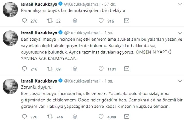 Kişisel sosyal medya hesabından paylaşımlarda bulunan Küçükkaya, hakkında yazılanlara tepki göstererek “Ben sosyal medya lincinden hiç etkilenmem ama avukatlarım bu yalanları yazan ve yayanlarla ilgili hukuki girişimlerde bulundu. Bu alçaklar hakkında suç duyurusunda bulunduk. Ayrıca tazminat davaları açıyoruz. Kimsenin yaptığı yanına kâr kalmayacak” ifadelerine yer verdi.