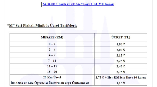 Zam gelmeden önce ise indi-bindi Minibüs ücretleri şu şekildeydi ;