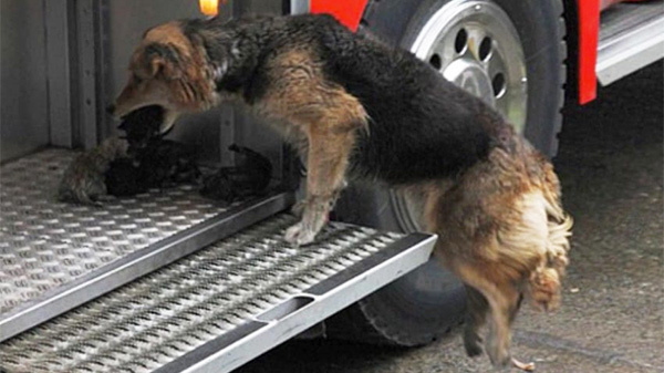 Amanda isimli anne köpek alevler saran binanın içine 10 günlük yavrularını kurtarmak için git gel yapıyordu. Yavrularını ise en güvenli olarak gördüğü yer, yani itfaiyeye taşıyordu.