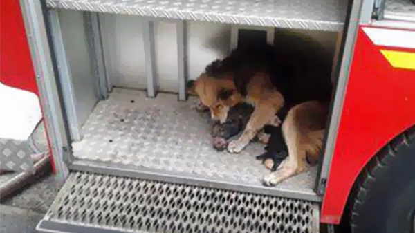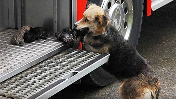 Amanda isimli anne köpek alevler saran binanın içine 10 günlük yavrularını kurtarmak için git gel yapıyordu. Yavrularını ise en güvenli olarak gördüğü yer, yani itfaiyeye taşıyordu.
