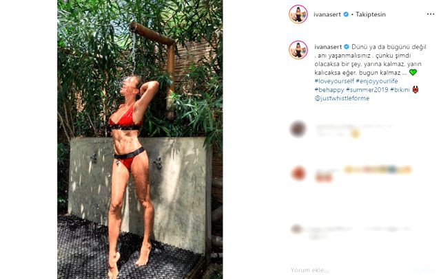 Sosyal medya hesabından bikinili fotoğrafını paylaşan Ivana Sert fotoğrafına,”Dünü ya da bügünü değil , anı yaşanmalısınız , çünkü şimdi olacaksa bir şey, yarına kalmaz, yarın kalıcaksa eğer, bugün kalmaz …” ifadelerini kullandı.