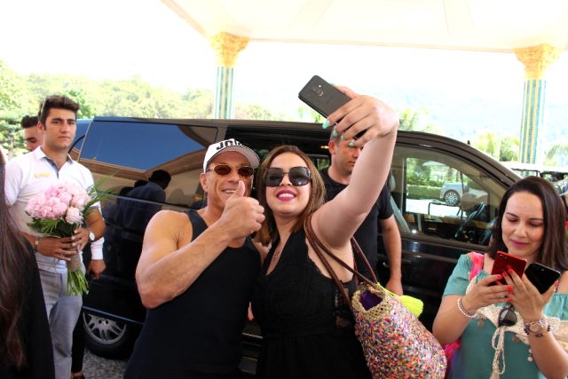 Dün akşam saatlerinde tatil için Bodrum’a gelen dünyaca ünlü aktör Jean Claude Van Damme, arkadaşıyla buluştuktan sonra bugün öğlen saatlerinde 5 yıldızlı bir otele geldi. Araçtan iner inmez sevgi seli ile karşılanan Jean Claude Van Damme, yerli ve yabancı turistlerle bol bol fotoğraf çektirdi. Damme’ı karşılarında gören bazı turistler ise şaşkınlıklarını gizleyemedi. Otele girer girmez yetkililerden sade Türk kahvesi isteyen Damme, Türk kahvesini çok sevdiğini söyledi.