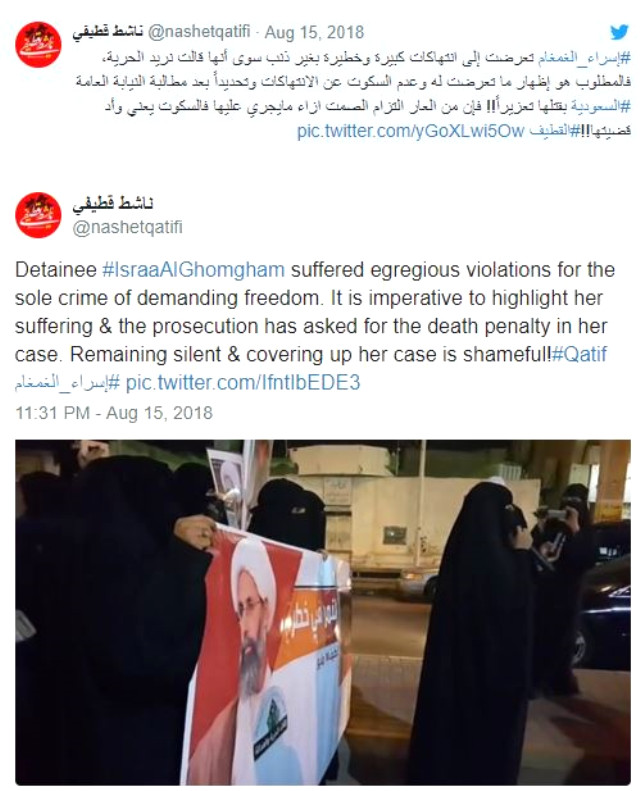Suudi Arabitan’ın başkenti Riyad’ta 6 Ağustos günü Ağır Ceza Mahkemesi’nde yapılan ilk duruşmada, Cumhuriyet Savcısı, Ghomgham ve kocası Moussa el-Haşem de dahil olmak üzere yaklaşık üç yıl hapis cezasına çarptırılan altı sanık için ölüm cezasını tavsiye etti. hükümet karşıtı protestolar, hükümdarın itaatsizliğini kışkırtma ve Şatı’nın çoğunluktaki Qatif’in doğu bölgesindeki hükümet karşıtı protesto gösterilerine katılanlara ahlaki destek sağladı.