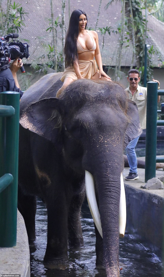 Kim, bu kez de fil üstünde ufacık bikinisiyle görüntülendi.