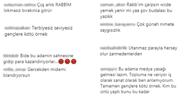 Durmaz’a “Terbiyesiz, seviyesiz gençlere kötü örnek”, “Çok günah nimete saygısızlık”, “Bu adama medya yasağı gelmesi lazım” gibi yorumlar geldi. Durmaz, sahneye hazırlandıktan sonra paylaştığı fotoğrafın da yemeklerin görünmedi dikkatlerden kaçmadı.