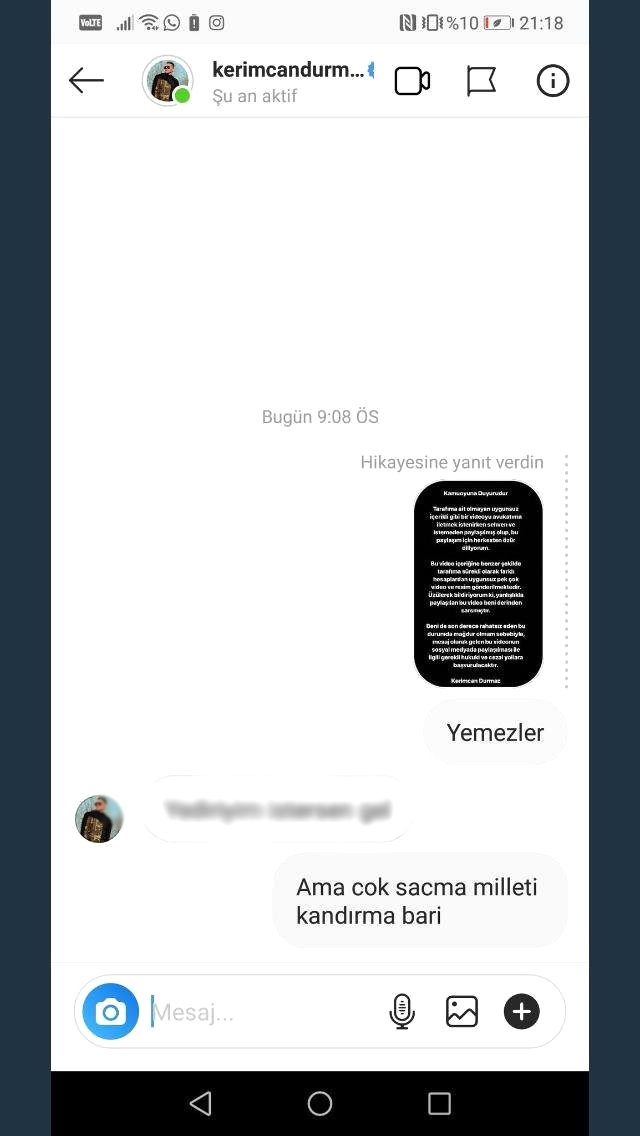 Kerimcan Durmaz’ın yaptığı açıklamayı inandırıcı bulmayan takipçisi Durmaz’a “Yemezler” yazarak karşılık verdi. Durmaz ise kendi üslubuyla takipçisine ahlak dışı bir cevapla karşılık verdi.