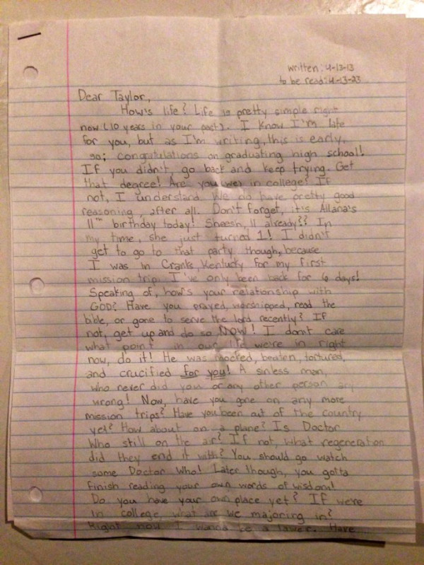 12 yaşındaki kızları Taylor vefat edince Tim ve Mary Smith’in dünyaları başlarına yıkıldı. Yaratıcı, hayat dolu ve zeki kız 5 Ocak 2014 tarihinde hayata gözlerini yumdu. Beklenmedik bir anda gerçekleşen trajedi sonrası ailesi, kızın eşyalarını karıştırmaya başladı. Bir kutunun içerisinde, kızın bir mektubunu buldular. Kız, 22 yaşında tekrar açmak üzere kendisine bir mektup yazmıştı. Mektubu 2023 yılında kendi açmayı planlamıştı küçük kız. Ancak artık böyle bir şey olamayacağı için anne ve babası mektubu okumaya karar verdiler. Aile, kızın gelecekteki haline mektup yazmasına şaşırmıştı elbette. Mektubu okumaya başladıktan hemen sonra ise hiçbiri göz yaşlarına hakim olamadı. Taylor’ın mektubunu okuyan Tim ve Mary, kızlarının düşüncelerinin onlara bir teselli olacağından habersizlerdi. Kızlarının mektubunu internette paylaştılar ve şimdiden yüz binlerce beğeni aldı mektup.