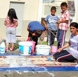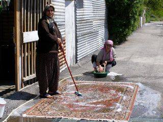 Bahar geldi genel temizlik ayları başladı, bizim çocukluğumuzda öyle halı yıkama makinesi, yada halı yıkama fabrikaları yoktu. Annelerimiz gün belirler o gün çumbur cemaat halı yıkanırdı maaile. Paçalar sıvanır, yada şortlar ayağa geçirilir başlanırdı halı yıkamaya. Herkesin bir halı yıkayacak beton dökülmüş bahcesi yoktu, çünkü o zaman çoğu bahçe topraktı. O yüzden en iyi yıkama yeri sokaktı ve hep o yüzden halılar camdan paldır küldür atılır, halıyı yıkayacağımız yer önce bir kırklanır o iş ne hitmetse hep iş bana kalırdı. Ne güzel günlerdi o günler, neyse efendim en iyi deterjan arap sabunu idi. Çogu zaman bizlerin sayesinde arap sabunu halı yıkaması bitmeden biterdi de annem “Allah canını almasın, ziyan ettin arap sabunun, git Ayşe teyzenden ödünç alda gel. Akşam oldu hale bitmedi halı yıkamamız” derdi. Halı yıkama işi imece halinde olurdu çoğu zaman, sokağın tüm kadınları sözleşir, aynı gün yıkardı halılarınını, bu tam çümbüş olurdu. Biz çocuklar yardım edeceğiz ayağı ile işlerini daha çok zorlaştırıyorduk çoğu zaman, ama çok eğlenirdik, o ayrı. En çokta mola verildiği zamanları severdik biz çocuklar çünkü o arada dilediğimiz şekilde oynardık su ile. Şimdi sokak ortasında halı yıkansa kriz olur, ama o zamanlar sokaktan geçen arabalar bile saygı gösterirdi bu kutsal göreve, diğer sokaktan geçer giderdi. Hortumla ilgilenmek biz çocuklara düşerdi çogu zaman, hortum mu dolandı, suyu kısmak, açmak biz çocukların görevi idi. Eee bu kadar görev arasında biraz da bizim eğlenmeye hakkımız var değil mi? Artık kim varsa, kuzen, kardeş arkadaş karşımızda ıslatmak en zevkli kısmıydı işin. Fırçalama işi evin büyük kızlarına düşen görevdi, bir hafta ahh kolum diye övünerek gezerdi evin içinde. Eee kutsal bir görev yapmış, mızmızlanmakta hakkı!. Bizim hakkımızda halı yıkanırken ara ve molalarda üzerinde takla atmaktı :) Halı püsküllerini yıkamak hep biz evin küçüklerine kalırdı, annem halıyı bitirdikten sonra hadi diğer halıyı yıkarken sende püsküllerini hallet derdi. Annem diğer halıyı bitirene kadar bende oynaya oynaya püskül yıkamayı hallederdim çoğunlukla