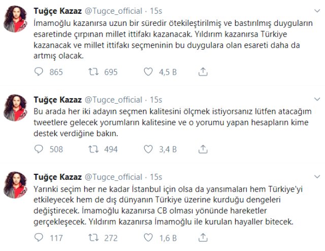 Söylemleri ve paylaşımlarıyla gündeme gelen Tuğçe Kazaz, bugün yapılacak seçime ilişkin yorumları ile yine sosyal medyayı salladı.
