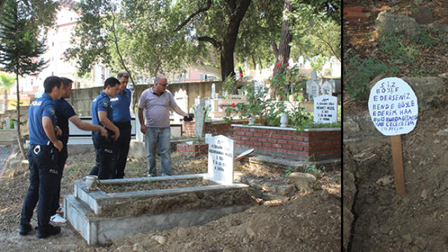 Yeğeni A.M.’ye ait mezarı ziyaret ettiği esnada dayısının mezarının yanına yeni bir mezar yapıldığını, iki mezar arasında mesafe olmadığını gördüğünü söyleyen R.İ. ifadesinde bunun üzerine kürek ile iki mezar arasına toprağı attığını ve mesafe açtığını, mezar taşını kırdığını ve “Siz böyle ederseniz ben de böyle ederim haa. Bu iş burada bitmedi. Yine geleceğim, siz seçin” yazısının bulunduğu tabelayı iki mezar arasına diktiğini söyledi. Şüpheli R.İ. hakkında Cumhuriyet Savcısının talimatı doğrultusunda adli tahkikat başlatıldı.