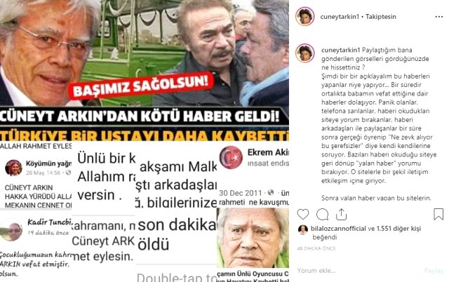 Murat Arkın, babasının Instagram hesabından yaptığı açıklamada şunları söyledi: “Paylaştığım bana gönderilen görselleri gördüğünüzde ne hissettiniz ? Şimdi bir bir açıklayalım bu haberleri yapanlar niye yapıyor… Bir süredir ortalıkta babamın vefat ettiğine dair haberler dolaşıyor. Panik olanlar, telefona sarılanlar, haberi okudukları siteye yorum bırakanlar, haberi arkadaşları ile paylaşanlar bir süre sonra gerçeği öğrenip “Ne zevk alıyor bu şerefsizler” diye kendi kendilerine soruyor. Bazıları haberi okuduğu siteye geri dönüp “yalan haber” yorumu bırakıyor. O sitelerle bir şekil iletişim etkileşim içine giriyor.
