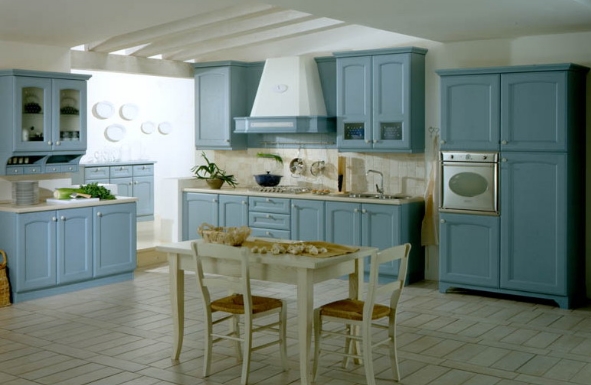 Mavi renklerdeki tasarımı ve ferah modeliyle mutfak dolabı örneği.