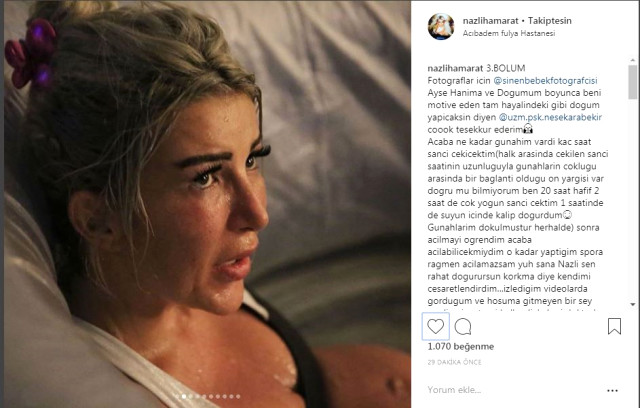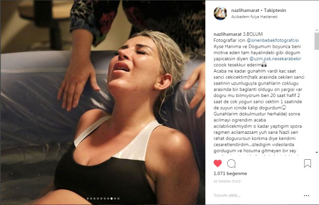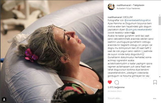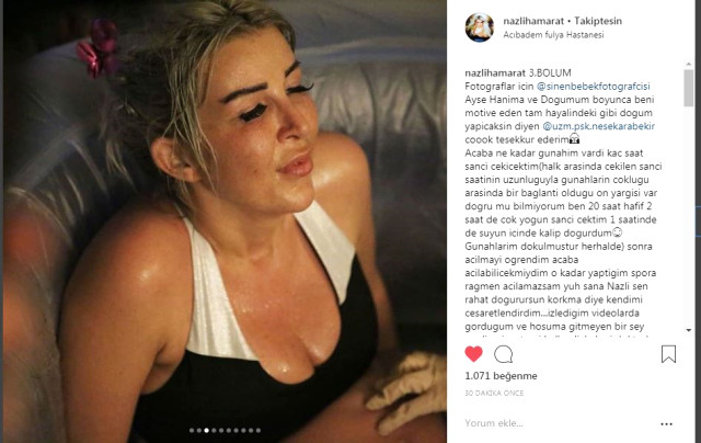 Paylaştığı fotoğrafları şu yorumu ekleyen Hamarat, “Acaba ne kadar gunahim vardi kac saat sanci cekicektim(halk arasinda cekilen sanci saatinin uzunluguyla gunahlarin coklugu arasinda bir baglanti oldugu on yargisi var dogru mu bilmiyorum ben 20 saat hafif 2 saat de cok yogun sanci cektim 1 saatinde de suyun icinde kalip dogurdum” ifadelerini kullandı.