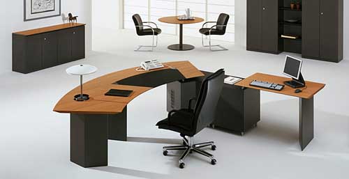 Oval ofis masa modeli. Siyah ve ahşap rengin uyumu.