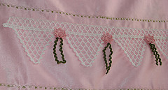 Bu örneği ise çarşaf danteli olarak da kullanıyoruz. Yapımı aynı olmakla birlikte farklı bir uygulamadır. Şekilde görebileceğiniz gibi aralara çiçek motifiyapılmıştır. Uçlardaki kurtçuklarda farklılık yaratmıştır.