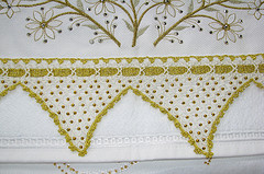 Bu örneğimiz ise tamamen örümcekten oluşuyor. Örnek olarak yapılan oya, direk havlunun kenarına örülmüş. Dikme derdimiz bu örnekte yok. Önce ipe boncuklar geçirilmiş, daha sonra da aynı işlemi yaparak git gellerle örümceklerle havlu kenarı tamamlanmıştır. Yaldızlı ip ve boncuklarla, havlunun da uyumuna dikkat edilerek sizlere şık bir örnek hazırladık.