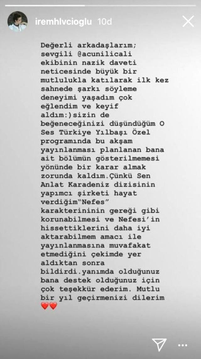 ”Sen Anlat Karadeniz’in yıldızı İrem Helvacıoğlu’nun sosyal medyasından yaptığı şu paylaşım, yapımcısıyla köprüleri attığının göstergesi. İşte Helvacıoğlu’nun oyuncu olarak yıldızını parlatan dizinin yapımcısı için yazdıkları: ‘O Ses Türkiye Yılbaşı Özel’e büyük bir mutlulukla katılarak ilk kez sahnede şarkı söyleme deneyimi yaşadım çok eğlendim ve keyif aldım. Sizin de beğeneceğinizi düşündüğüm programda bana ait bölümün gösterilmemesi yönünde bir karar almak zorunda kaldım. Çünkü ‘Sen Anlat Karadeniz’ dizisinin yapımcı şirketi hayat verdiğim Nefes karakterinin gereği gibi korunabilmesi ve hissettiklerini daha iyi aktarabilmem amacıyla muvafakat etmediğini, çekimde yer aldıktan sonra bildirdi.” ‘Dizi karakterlerini korumak yapımcıdan önce oyuncuya düşmez mi?’ tartışmasını bir yana bırakın, bu iş nasıl oldu da bu noktaya geldi?