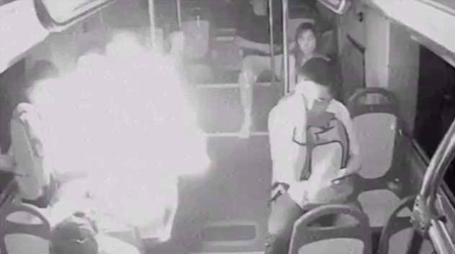 Çin’de yolda seyir halinde olan otobüsün içinde bulunan yolcular, bir anda yükselen ışığı görünce neye uğradığını şaşırdı. Bir adamın sırtındaki sırt çantası bir anda yanmaya başladı.