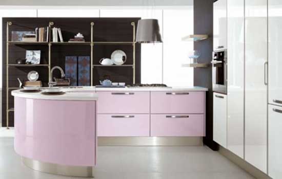Beyaz mutfak dolaplarıyla pembe oval tezgah oldukça modern duruyor.