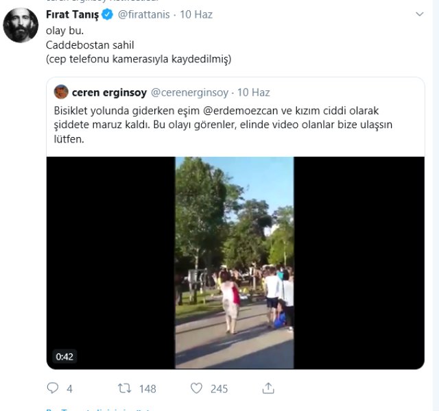 Erginsoy twitter hesabı üzerinden, “Eşim Erdem Özcan ve kızım Kumsal bisiklet yolunda giderken, bisiklet yolunda ısrarla duran piknikçileri uyardılar. Ama ciddi olarak şiddete maruz kaldılar. Neyse ki belediye çalışanları ve 112 yetişti yardıma. Durumla ilgili videolar veya şahitler varsa ulaşabilir mi? Çünkü mobese çalışmıyormuş” dedi.