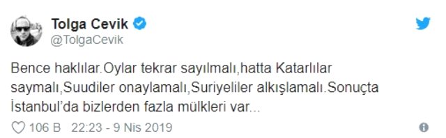 “Bence haklılar. Oylar tekrar sayılmalı, hatta Katarlılar saymalı, Suudiler onaylamalı, Suriyeliler alkışlamalı. Sonuçta İstanbul’da bizlerden fazla mülkleri var…”