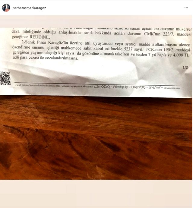 Oyuncu Serhat Osman Karagöz, sosyal medya hesabından eşi Pınar Karagöz’e verilen cezaya tepkisini şu sözleriyle dile getirdi: ”Narcos dizisini izleyip, üstüne escobar ile attığı tweet yüzünden 7 yıl hapis cezası üstüne para cezası aldı Pucca… Yok yok aklınızı kaybetmediniz ben de ilk önce öyle düşündüm