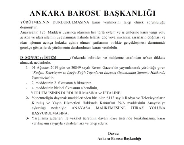 Ankara Barosu, 1 Ağustos tarihinde Resmi Gazete’de yayınlanarak yürürlüğe giren ve Radyo ve Televizyon Üst Kurulu ile Bilgi Teknolojileri ve İletişim Kurumu tarafından hazırlanan ‘Radyo, Televizyon ve İsteğe Bağlı Yayınların İnternet Ortamından Sunumu Hakkında Yönetmelik’ hakkında iptal istemiyle dava açtığını duyurdu.