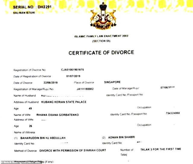 Kuala Lumpur merkezli New Straits Times gazetesi çiftin 1 Temmuz’da boşandığını yazdı. İddiaya göre Sultan 5. Muhammed, Okşana’ya 3 kez “Boş ol” dedikten sonra çiftin evliliği resmen sona erdi.