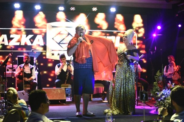 Konserinin ikinci yarısına Safiye Soyman’ın binlerce liralık “Tuvalet”ni boynuna dolayarak çıkan Faik Öztürk, etkinlik alanındakileri gülmekten kırdı geçirdi. “Safiye bu kıyafet sana hiç olmamış, seni kilolu göstermiş aşkım” sözleriyle hayat arkadaşına takılan Faik Öztürk, “Zaten sayende modacılara çalışıyoruz. Seni kendi elbisenle protesto ediyorum” diyerek askısı ile birlikte boynuna doladığı tuvaletle sahnede turladı.