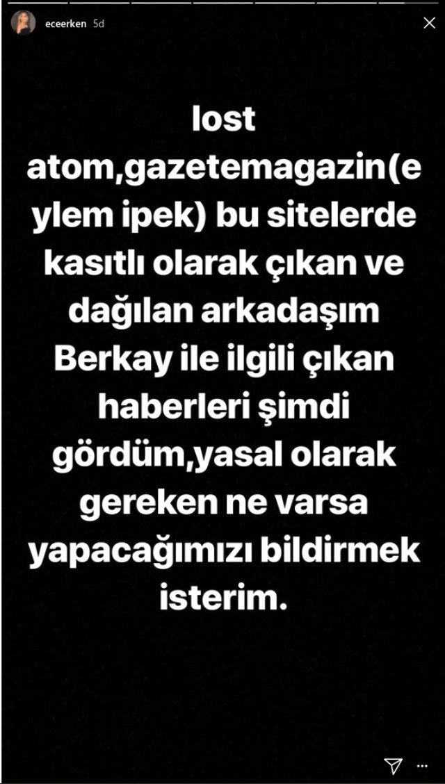 Instagram hesabının hikayesi kısmından açıklama yapan Ece Erken, “Lost Atom, Eylem İpek bu sitelere kasıtlı olarak çıkan ve dağılan arkadaşım Berkay ile ilgili çıkan haberleri şimdi gördüm. Yasal olarak gereken ne varsa yapacağımızı bildirmek isterim.” dedi.