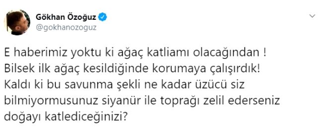 Şarkıcı Gökhan Özoğuz, Kaz Dağları civarındaki altın madeni hakkında açıklama yapan AK Parti Grup Başkanvekili Bülent Turan’a Twitter hesabından yaptığı paylaşımla cevap verdi.