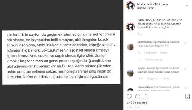 Ebru Şancı, Yeşim Salkım ve Arto gibi isimlerin tepki göster de Kerimcan Durmaz’a bir tepki de şarkıcı Hilal Cebeci’den geldi. Gündemi sarsan konu hakkında açıklama yapan Cebeci, şunları söyledi: “İsimlerini bile sayfamda geçirmek istemediğim internet fenomeni adı altında ne iş yaptıkları belli olmayan, akli dengeleri bozuk sapkın insanların otobüste kadını taciz edenden, köpeğe tecavüz edenden hiçbir farkı yoktur.