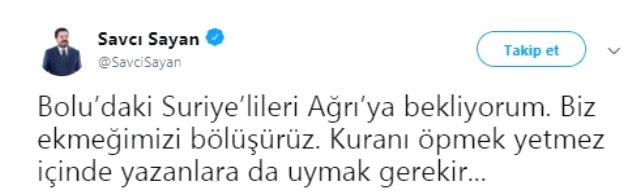 Ağrı Belediye Başkanı Savcı Sayan, CHP’li Tanju Özcan’a sosyal medyada üzerinden tepki gösterdi. Sayan twitter hesabından yaptığı açıklamada, “Bolu’daki Suriye’lileri Ağrı’ya bekliyorum. Biz ekmeğimizi bölüşürüz. Kur-an’ı öpmek yetmez içinde yazanlara da uymak gerekir…” ifadelerini kullandı.