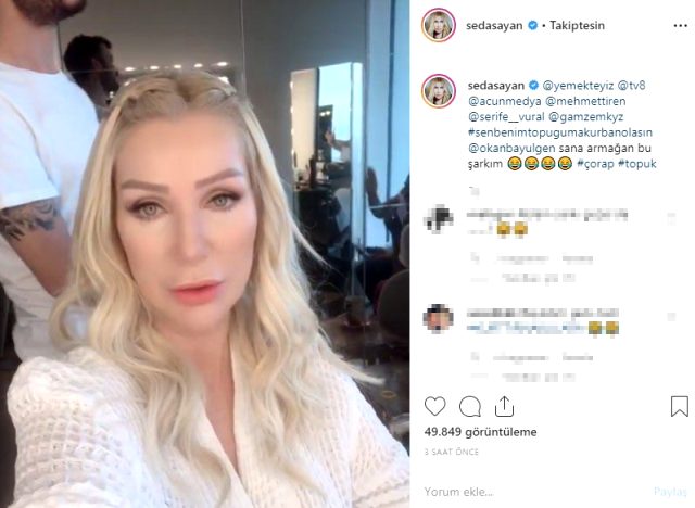Sayan ise kendisini tiye alan Okan Bayülgen’e “Sen benim topuğuma kurban olasın” şarkısıyla karşılık verdi. Yemekteyiz’in setinde video çeken Sayan, Instagram hesabında paylaştığı videoya Bayülgen’i etiketleyerek “Sana armağan bu şarkım” dedi.
