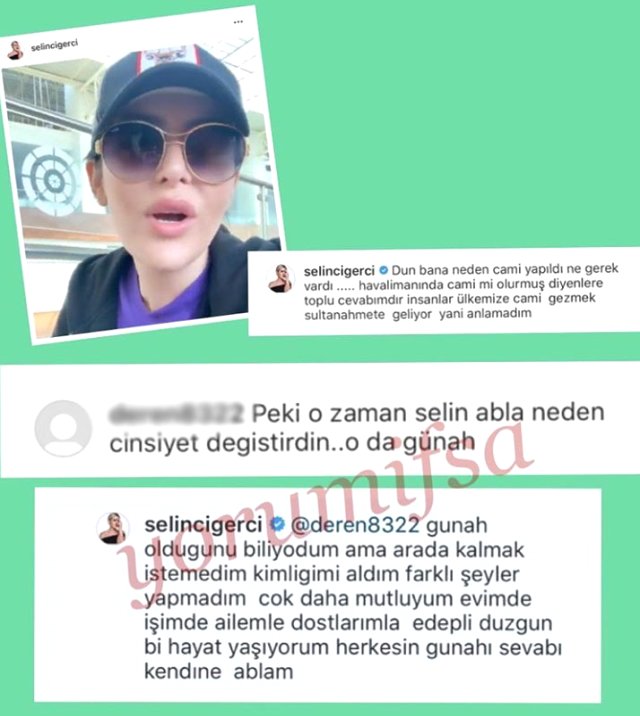 Bir takipçisinin sorduğu “Selin abla neden cinsiyet değiştirdin? O da günah” sorusu üzerine çok geçmeden yanıt veren Ciğerci, “Günah olduğunu biliyordum ama arada kalmak istemedim.” diyerek şu açıklamada bulundu:Kimliğimi aldım farklı şeyler yapmadım çok daha mutluyum. Evimde, işimde, ailemle dostlarımla edepli düzgün bir hayat yaşıyorum. Herkesin günahı sevabı kendine” dedi.