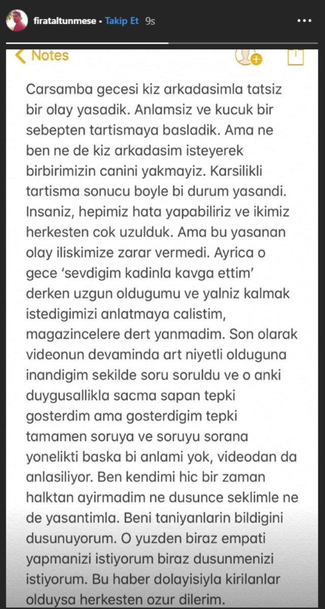 Muhabirlerin, “Geçmiş olsun” sorusuna Fırat Altunmeşe, “3 yıllık sevgilim, aşık olduğum kadın bana bunu yaptı” demişti. Ünlü oyuncu tartışmanın sebebini söylememişti. Çıkan haberlerin ardından ünlü oyuncu Fırat Altunmeşe, sosyal medya hesabından açıklama yaptı. Altunmeşe, “Bu yaşanan olay ilişkimize zarar vermedi” diyen Altunmeşe, Çarşamba gecesi kız arkadaşımla tatsız bir olay yaşadık. Anlamsız ve küçük bir sebepten tartışmaya başladık ama ne ben, ne de kız arkadaşım isteyerek birbirimizin canını yakmayız. Karşılıklı tartışma sonucu böyle bir durum yaşandı. İnsanız, hepimiz hata yapabiliriz ve ikimiz herkesten çok üzüldük ama bu yaşanan olay ilişkimize zarar vermedi. Ayrıca o gece “Sevdiğim kadınla kavga ettim” derken üzgün olduğumu ve yalnız kalmak istediğimizi anlatmaya çalıştım, magazincilere dert yanmadım. O anki duygusallıkla saçma sapan tepki gösterdim. Ben kendimi hiçbir zaman halktan ayırmadım. Ne düşünce şeklimle ne de yaşantımla. Beni tanıyanların bildiğini düşünüyorum. O yüzden biraz empati yapmanızı istiyorum, biraz düşünmenizi istiyorum. Bu haber dolayısıyla kırılanlar olduysa herkesten özür dilerim.” ifadelerini kullandı.