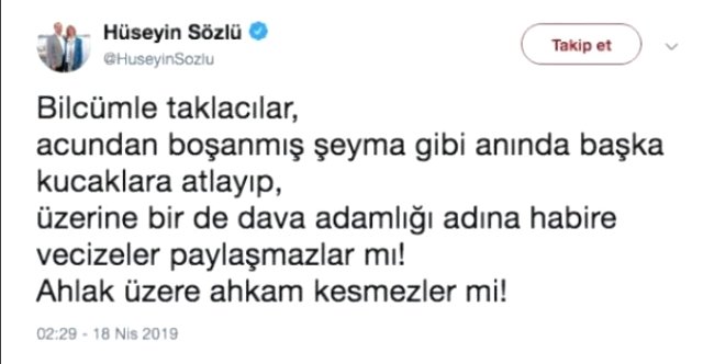 Subaşı’nın avukatı Emek Emre şikayet dilekçesinde 31 Mart Yerel Seçimlerini kaybeden Hüseyin Sözlü’nün, ‘dava adamlığı’ tartışması adı altında, 18 Nisan’da Twitter’da yaptığı paylaşımda Şeyma Subaşı’na hakaret edildiğini belirtti.