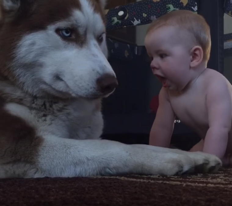 Sibirya kurtları hem sosyal hem de inatçı olmalarıyla bilinirler. Bu nedenle bebeğin köpeğin üstüne doğru yuvarlandığını görünce başta endişelenmedim değil.
