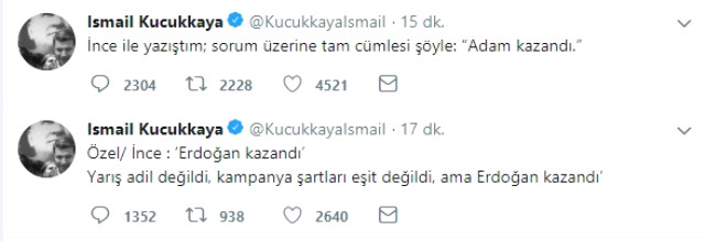Öte yandan Halk TV’de yayın yapan Şaban Sevinç de izleyicilerine benzer bir Muharrem İnce mesajı aktardı. Sevinç, İnce’nin kendisine “Seçim adil değildi ancak Erdoğan kazandı” dediğini aktardı.