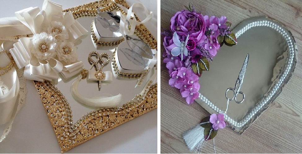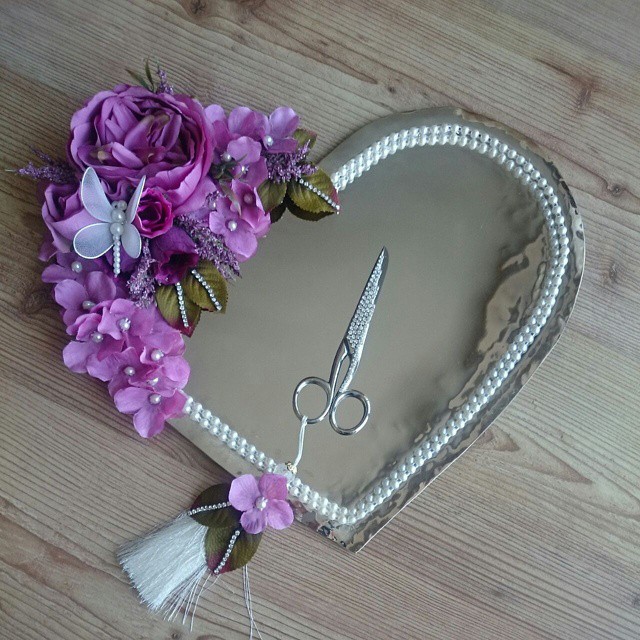Galerimde ki swarovski taş süslemeli nişan tepsilerinde öne çıkan süsleme kesinlikle kurdelenin kesildiği makasın swarovski taşlar ile süslenmesi diyebilirim ne dersiniz? Süslemeler ile adeta aksesuarı andıran nişan tepsilerini iler ki zamanlarda şık ve dekoratif görümümü ve hatırası nedeni ile evinizin en özel köşesinde sergileyebilirsiniz. Gerçi uzun ve telaşlı düğün ve nişan arifesine ne kadar bu tarz tasarımlara vakit ayrılır bilemem. En iyisi siz kızınızın veya oğlunuzun çeyizine önceden bu tarz bir hazırlık yapmak mümkün. Evet sevgili bayanlar ve nişan alışverişi telaşında ki gelinlik kızlar şimdi dilerseniz sizler için seçtiğim muhteşem nişan tepsisi tasarımları birlikte inceleyerek en özel parçaları yorumlayalım. Eminim ki sizler için seçtiği farklı süslemeli nişan tepsisi tasarımlarım arasında seçim yapmakta benim kadar zorlanacaksınız benden söylemesi. Gelelim galerim de en çok beğendiğim nişan tepsisi modellerine. İlk sırada yer alan altın kaplama tepsi ve mor kurdele ile süslenmiş kalp şeklinde ki nişan tepsisi modelim galerimin en özel parçası ayrıca swarovski taşlar yanında uygulanan inci süslemeli nişan tepsilerinde oldukça iddialı ve zarif sevgili hanımlar. Şahsen inci mi swarovski taş mı diyecek olursanız benim tercihim kesinlikle swarovski taşlı nişan tepsilerinden yana. Zevkler ve renkler tartışılmaz diyerek sizi muhteşem nişan tepsisi görselleri ile baş başa bırakıyorum hoşçakalın.