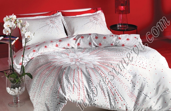 Beyaz üstüne kırmızı desenli saten nevresim takımı açık renk tercih edenler için ideal bir desen.