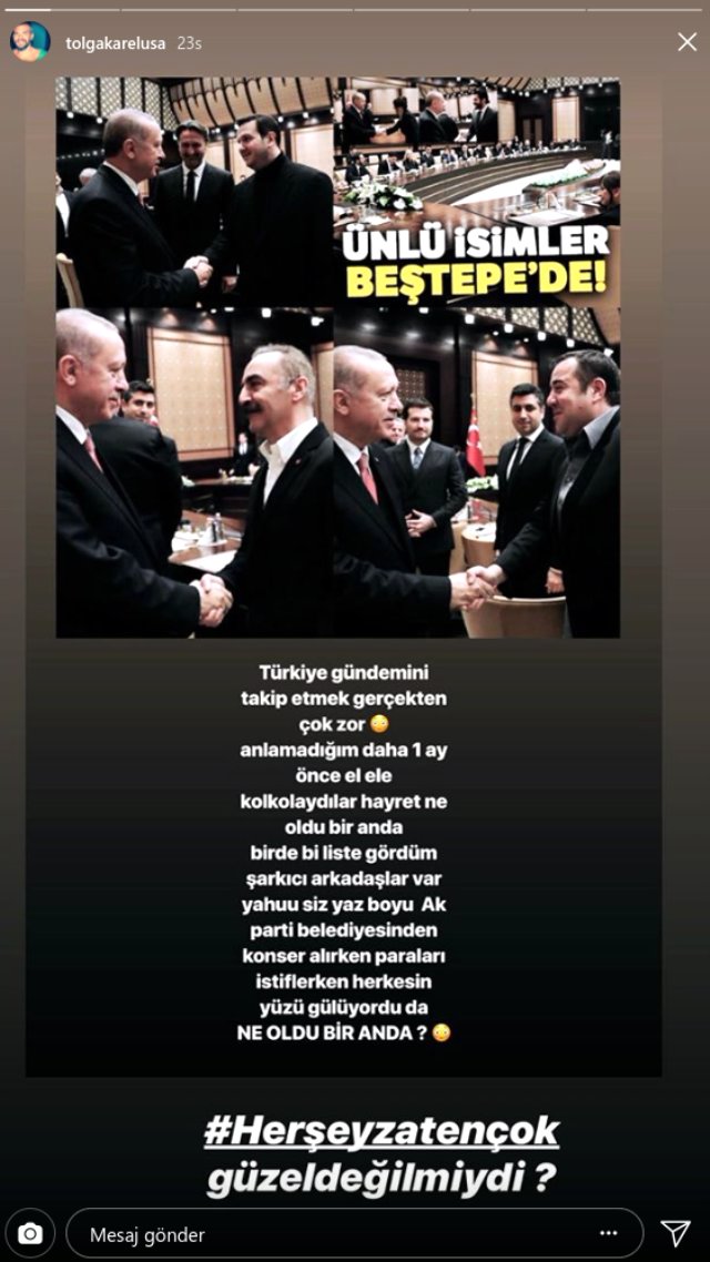 Karel sosyal medya hesabından “Türkiye gündemini takip etmek gerçekten çok zor. Anlamadığım daha 1 ay önce el ele kolkolaydılar hayret! Ne oldu bir anda? Bir de lise gördüm şarkıcı arkadaşlar var. Yahu siz yaz boyu Ak Parti Belediyesinden konser alırken paraları istiflerken herkesin yüzü gülüyordu da ne oldu bir anda? Her şey zaten çok güzel değil miydi?” notuyla destek olan ünlü isimlere yüklendi.