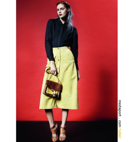 Diz altı, önden düğmeli etek modeli ile 70′li yıllardan esintiler.