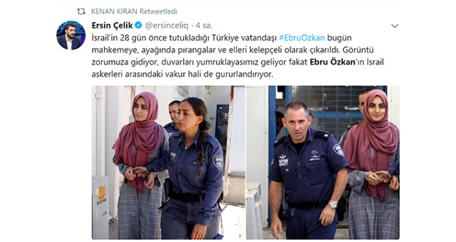 Kudüs’e yaptığı ziyaretin ardından 11 Haziran’da Türkiye’ye dönmek için geldiği Tel Aviv’deki Ben Gurion Havalimanı’nda gözaltına alınan Ebru Özkan, elleri kelepçeli, ayağında ise prangayla mahkemeye çıkarıldı.